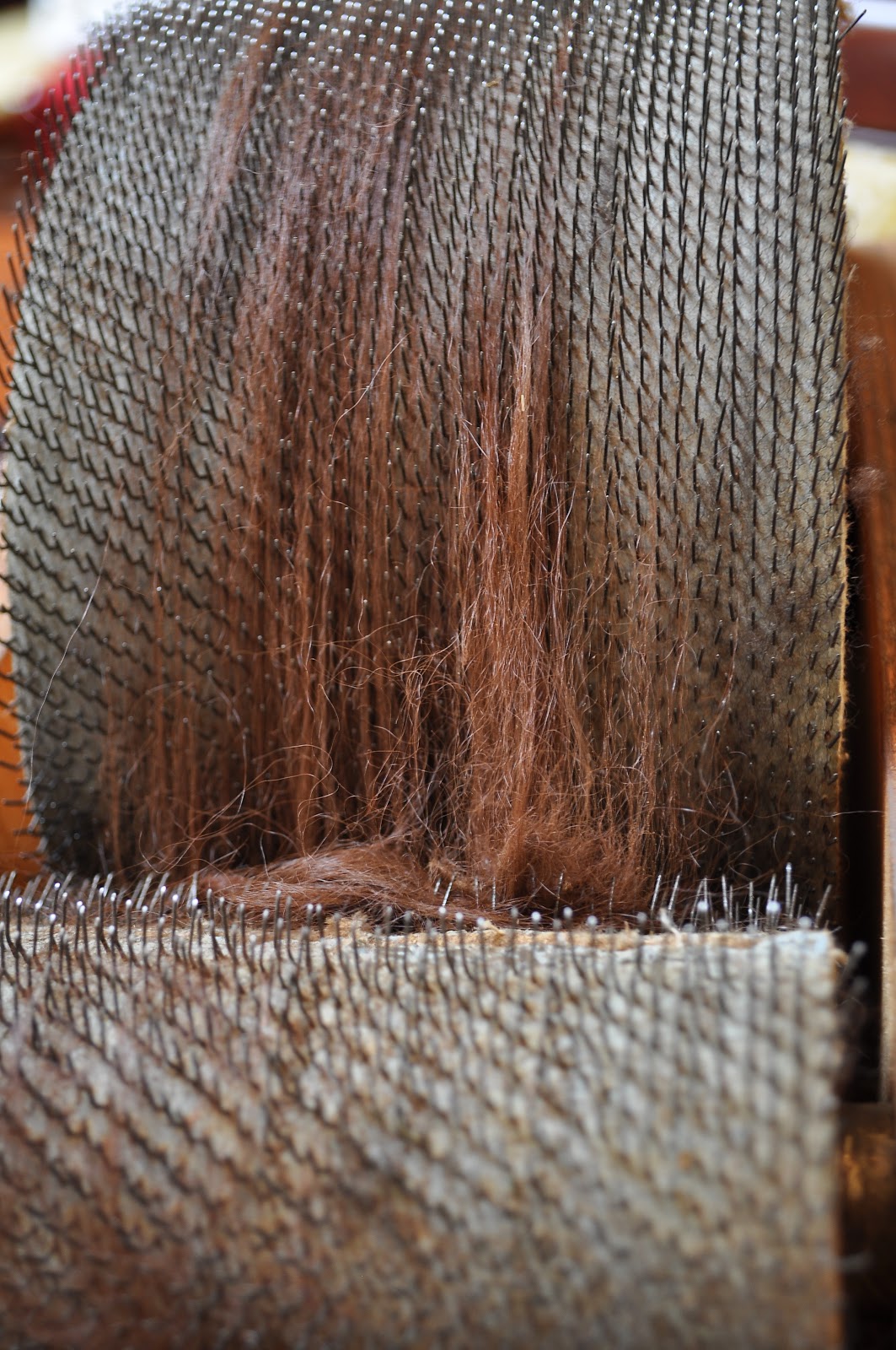 Now I get silly. The color of this stuff is really lovely. One bag is an oak color, the other is burguny. Only problem: the burgundy matches my own hair color. I swear, when it comes out of the carder it looks like the stuff i take out of my own hairbrush! Ew! Gross! Gross! Gross! Gross! Gross!
